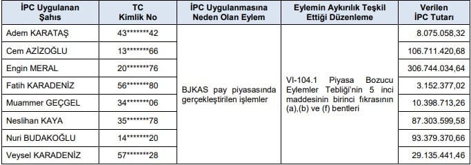 Öte yandan SPK, piyasa bozucu eylemler nedeniyle Kuyaş Yatırım AŞ ve Beşiktaş Futbol Yatırımları Sanayi ve Ticaret AŞ paylarında işlem yapan çok sayıda kişi hakkında idari para cezaları uygulanmasına karar verdi.