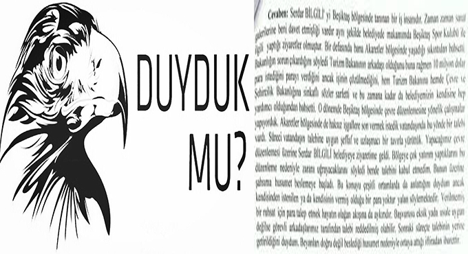 "Akaretler bölgesinde haksız işgallere son vermek istedik, vatandaşın da bu yönde bir talebi vardı. Yapacağımız çevre düzenlemesi üzerine Serdar Bilgili belediyeye ziyaretime geldi. Bölgeye çok yatırım yaptıklarını, bu düzenleme nedeniyle zarara uğrayacaklarını söyledi. Ben de talebini kabul etmedim. Bunun üzerine şahsıma husumet beslemeye başladı. Kendisinden istenilen ya da kendisinin vermiş olduğu bir para yoktur, yalan söylemektedir."