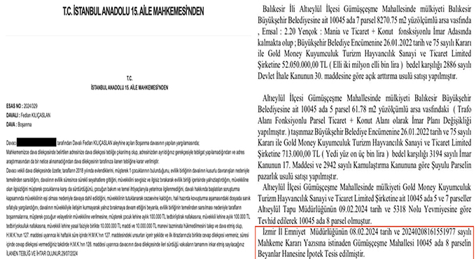 İzmir Emniyet Müdürlüğü’nün, 8 Şubat 2024 tarihli 161551977 Sayılı mahkeme kararına istinaden Kılıçaslan’ın 52 Milyon Liraya aldığı arazinin tapudaki beyanlar hanesine ipotek tesis edildi. Yani tedbir konuldu. Karar, Yerlikaya’nın açıkladığı operasyondan yaklaşık iki ay sonra alındı.