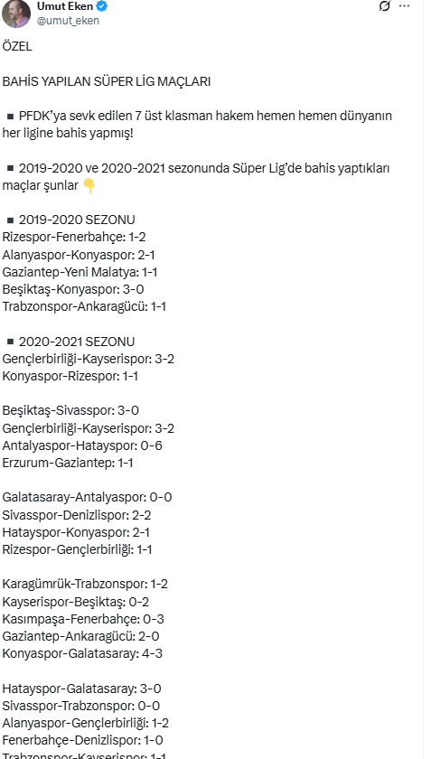 Türkiye Futbol Federasyonu (TFF) bahis oynadığı belirlenen 152 hakemi PFDK’ye sevk ederken ilginç bir iddia ortaya atıldı. Umut Eken’in haberi göre hakemlerin 2019-2020 ve 2021-2021 sezonunda bahis oynadığı maçlar şu şekilde: